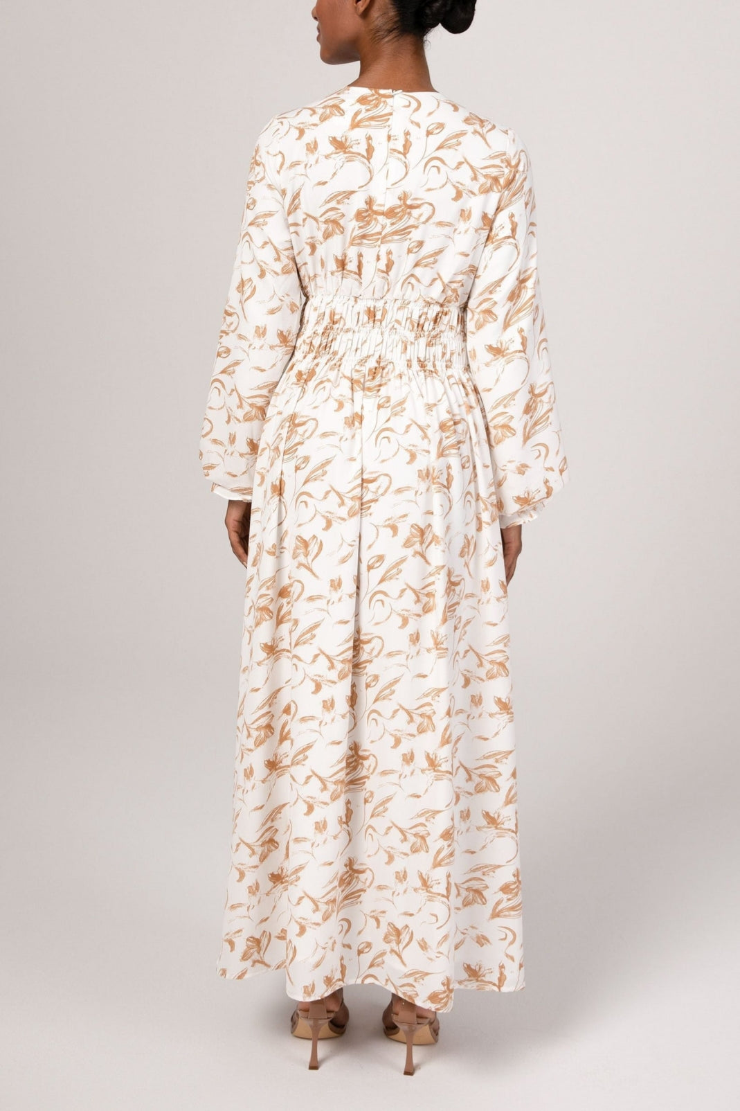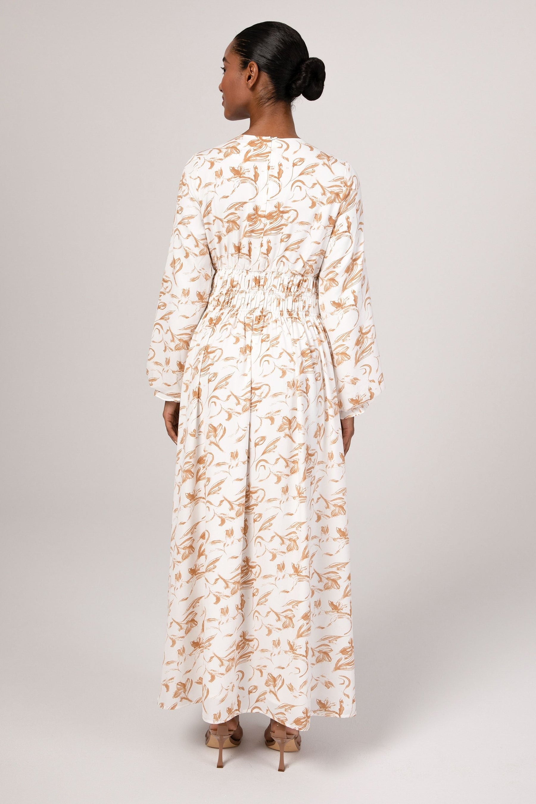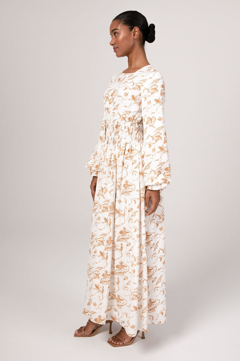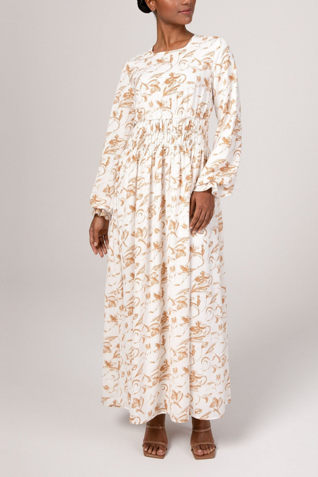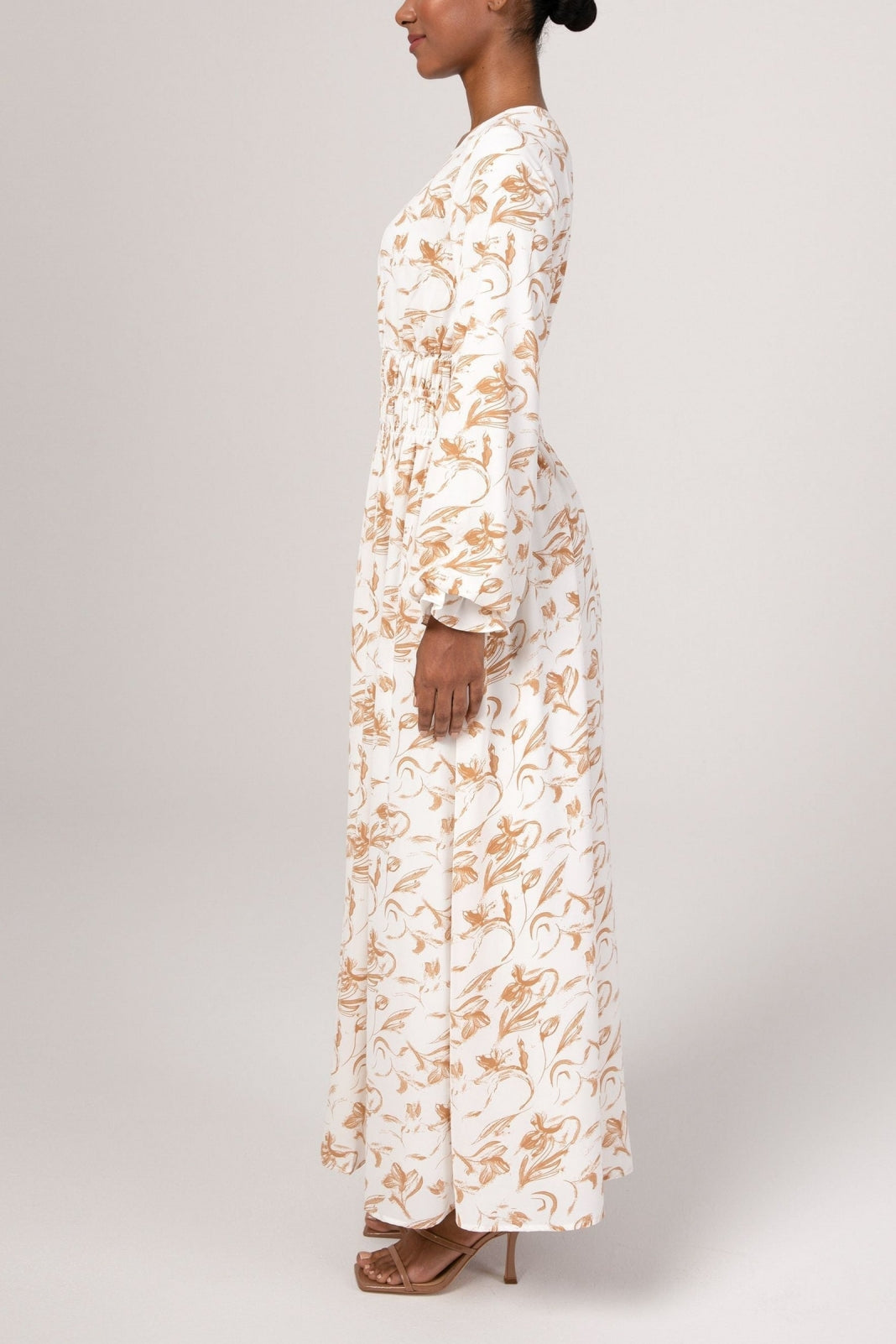 The Ikram maxi dress features a feminine rouched waist, elastic cinched sleeves and a flowy bodice.