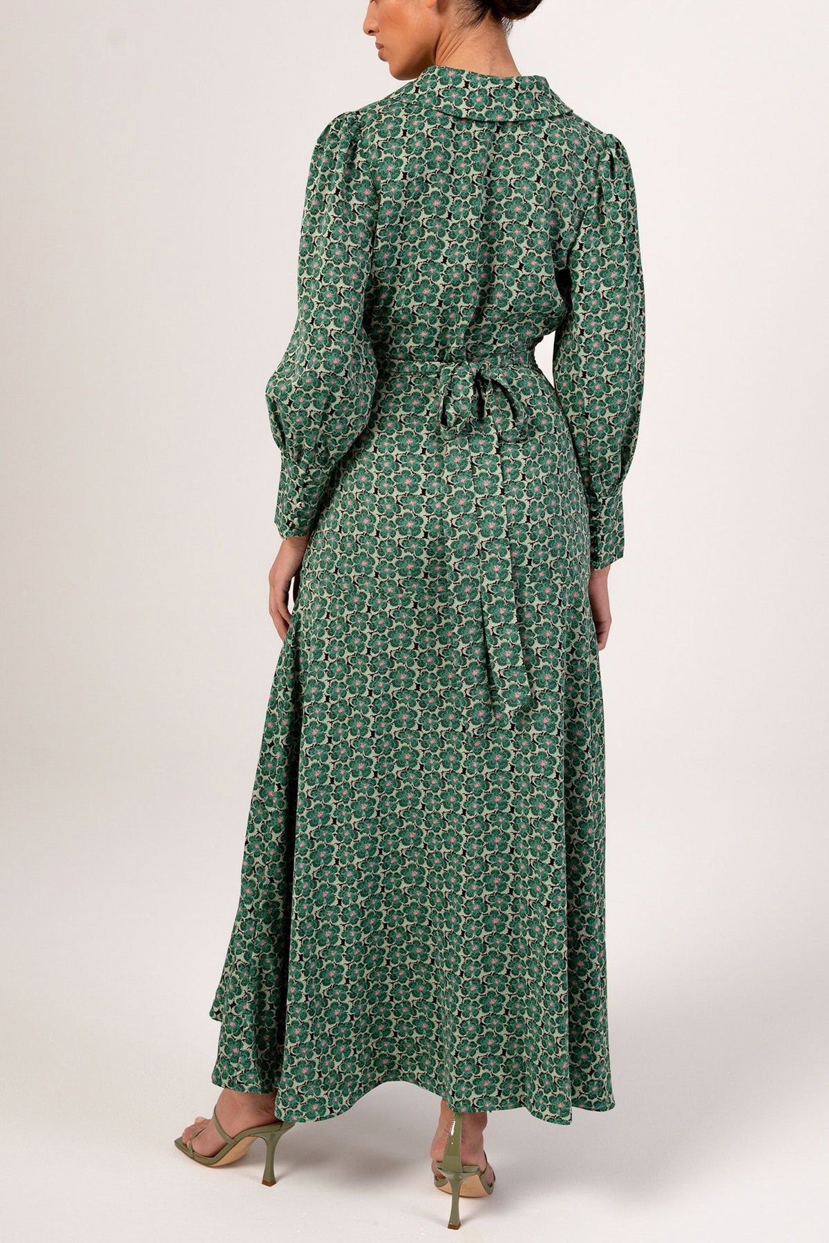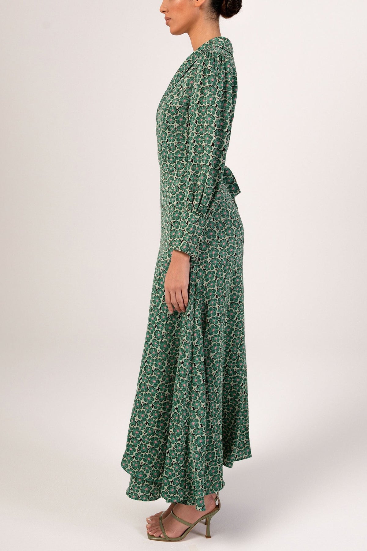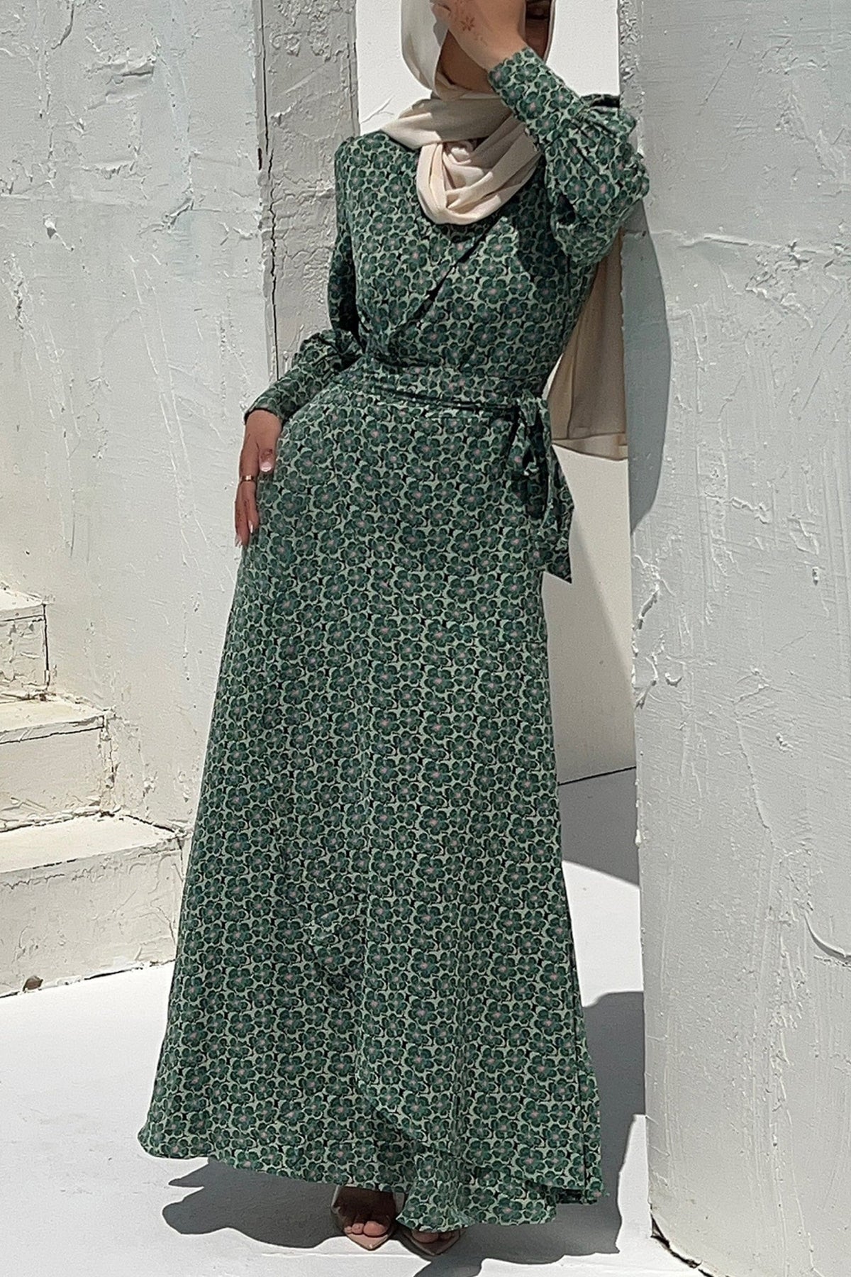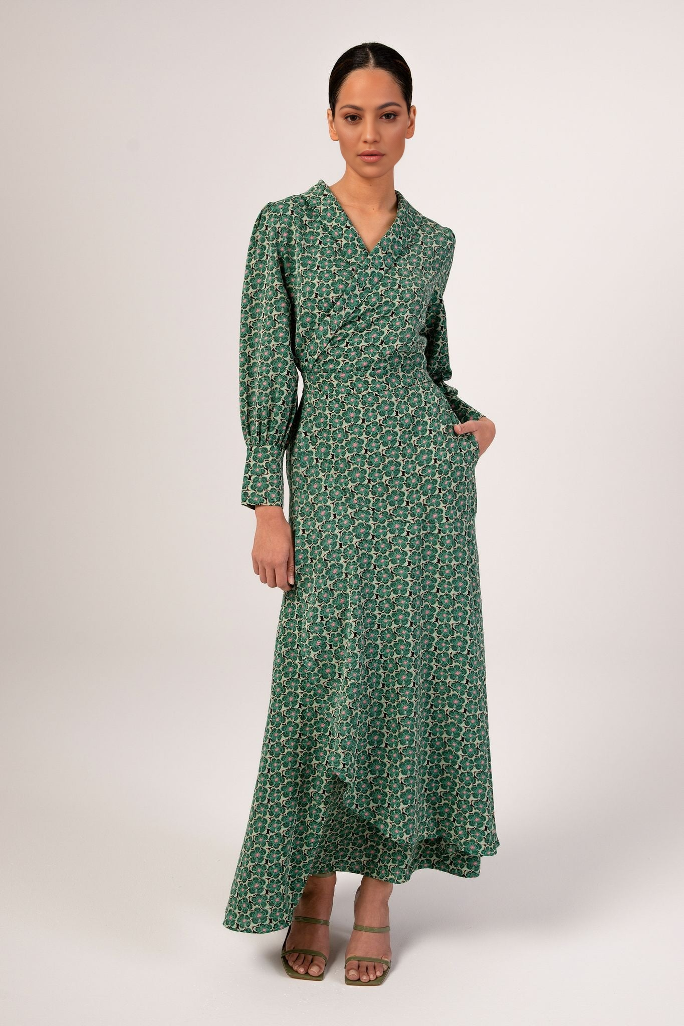 The Emaly maxi dress features a faux wrap front, modest v-neck, and an attached self fabric tie belt.