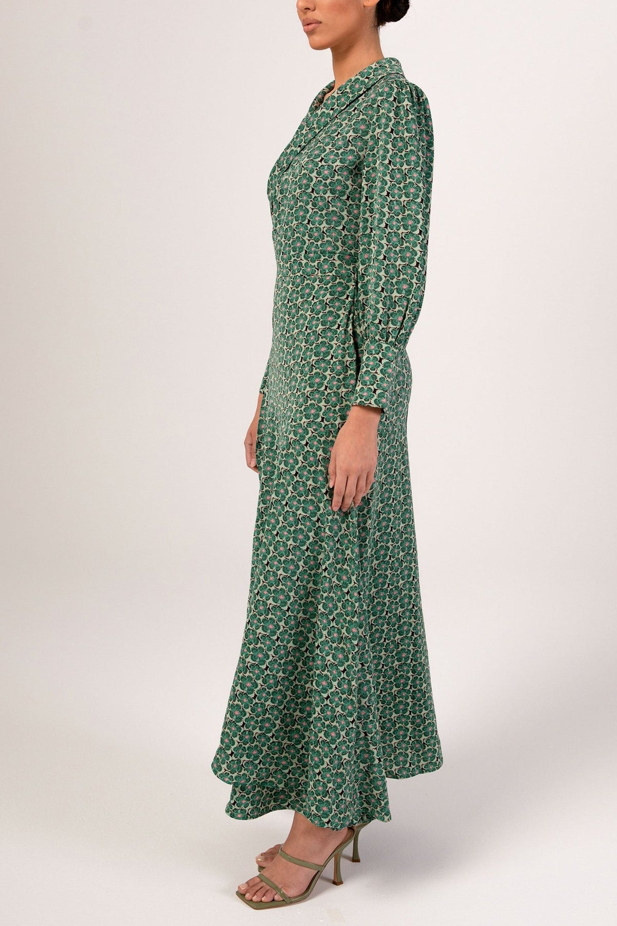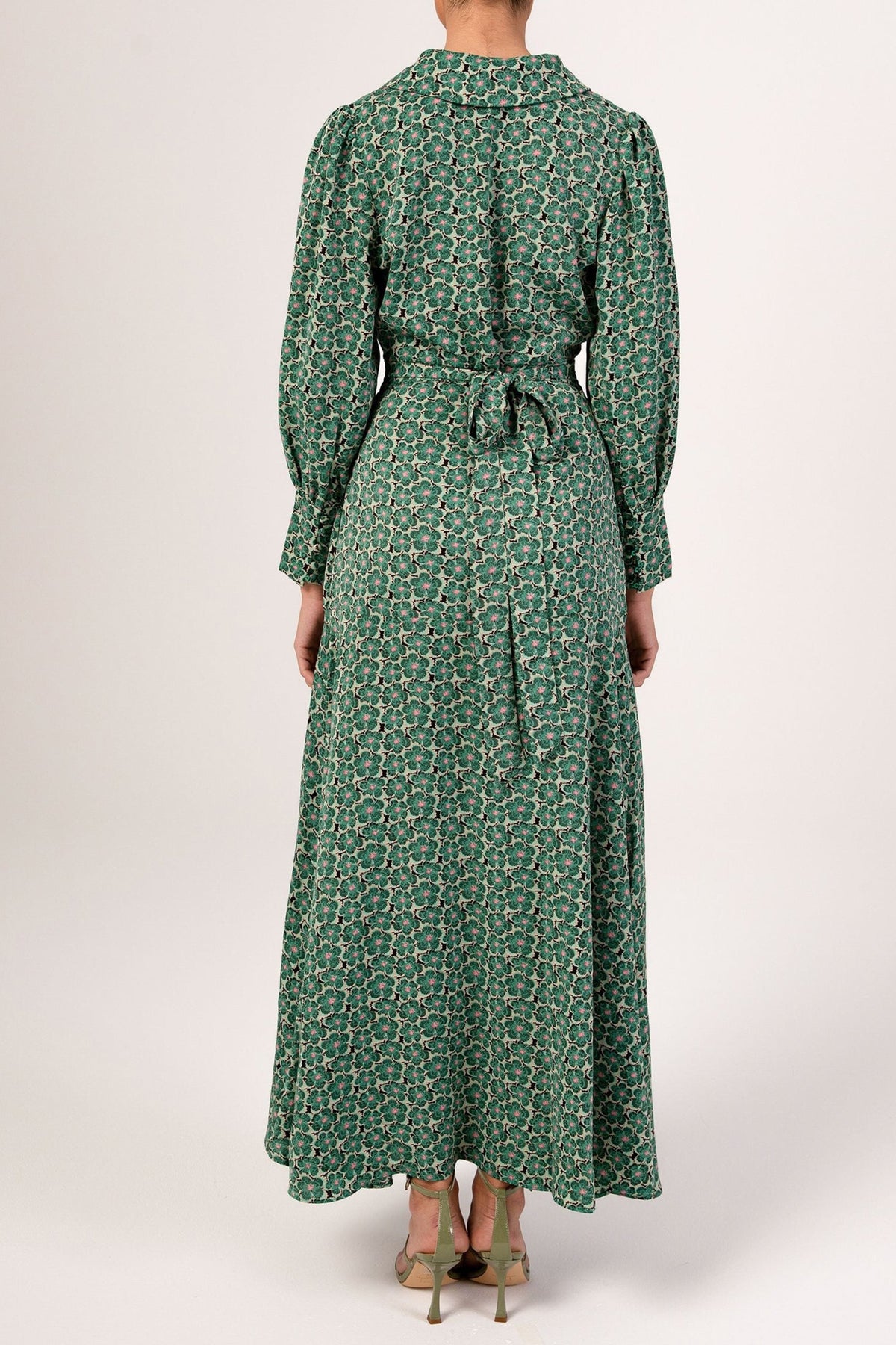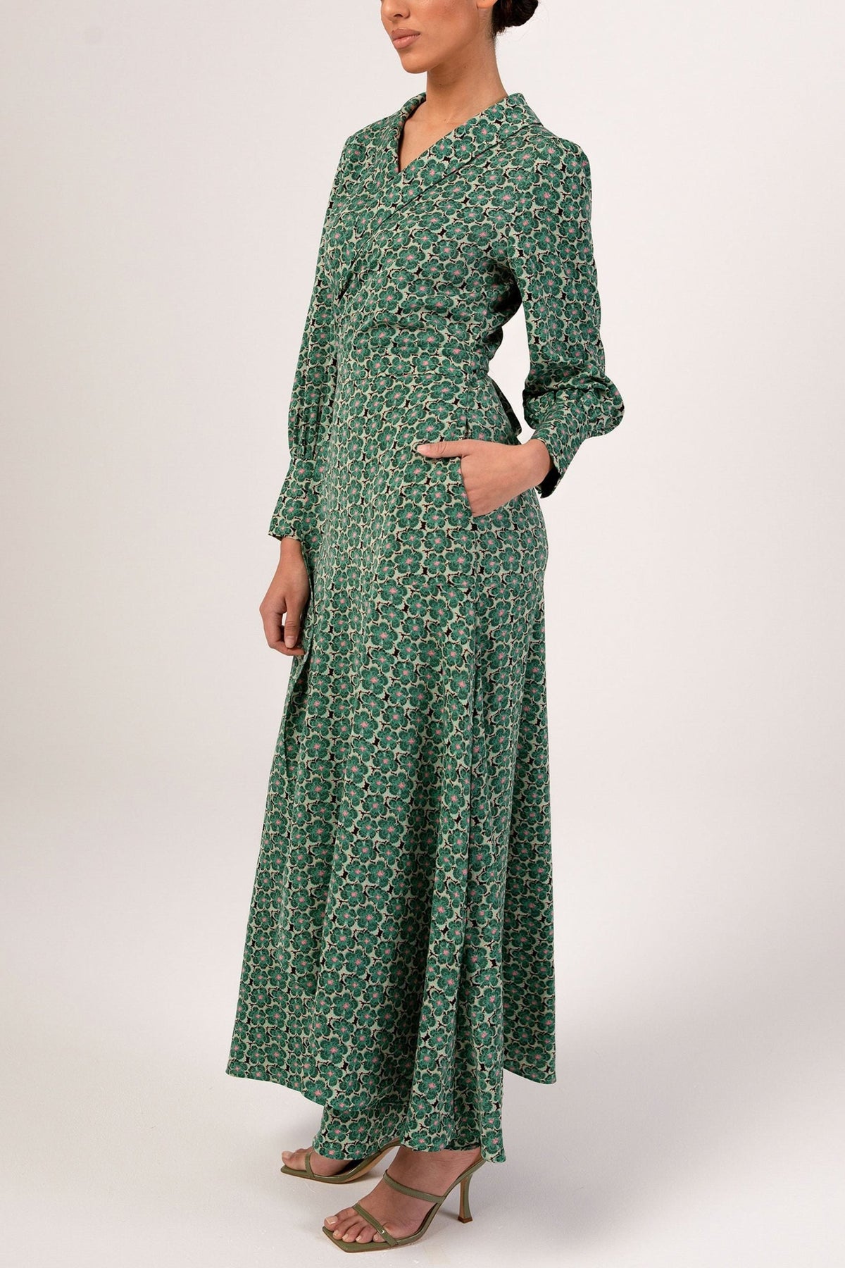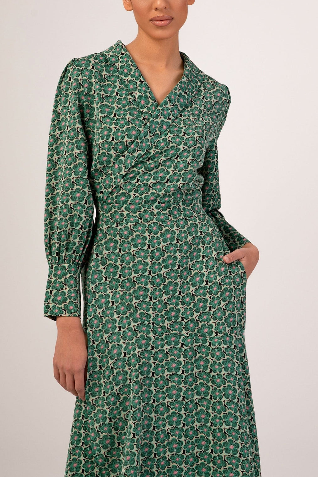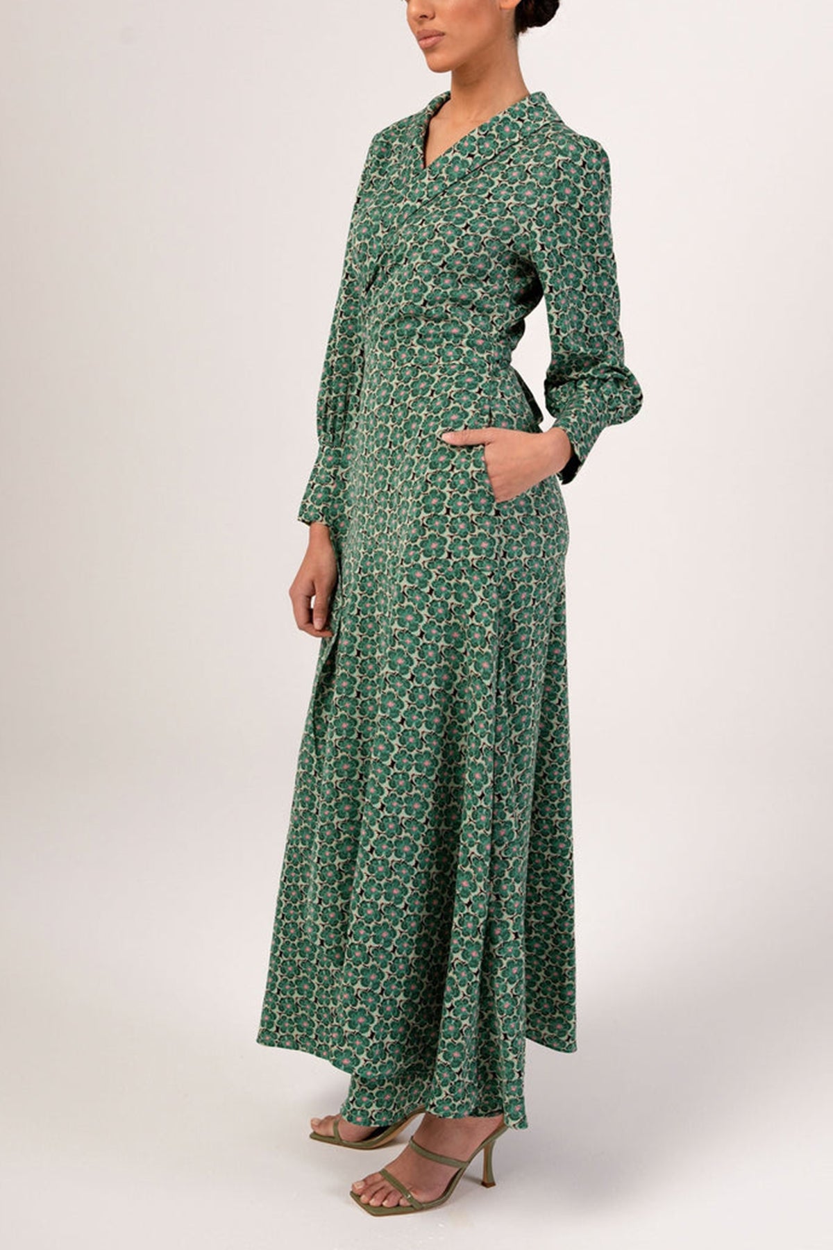 The Emaly maxi dress features a faux wrap front, modest v-neck, and an attached self fabric tie belt.