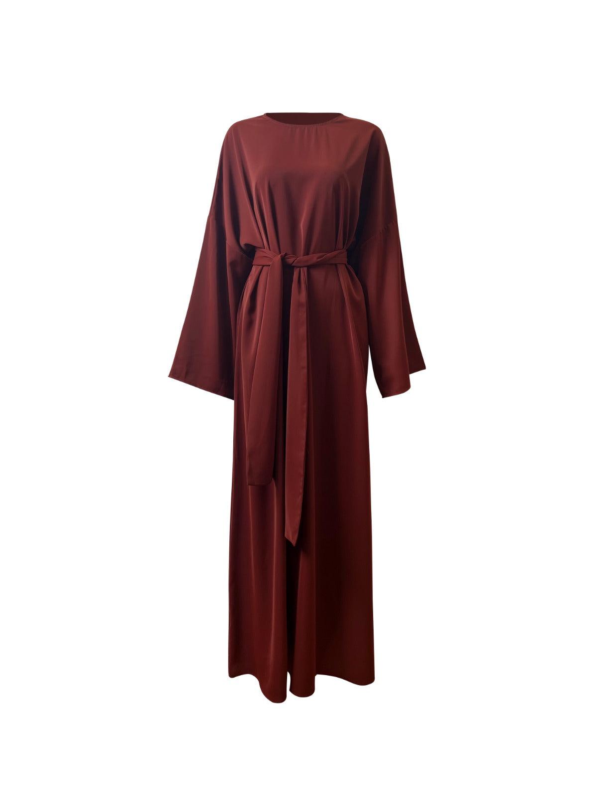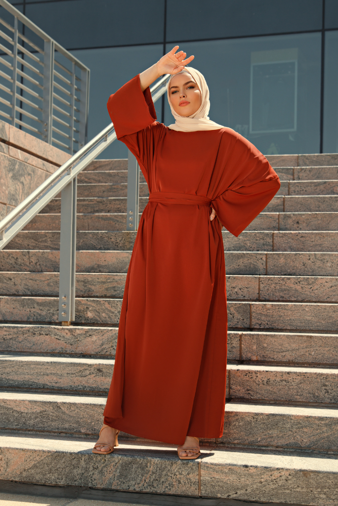 The Nura abaya is a loose-fitting, full-length garment made from a lightweight, flowing fabric. The Nura is a simple abaya with a detachable belt designed with a basic, straight-cut silhouette that skims the body without clinging. This  abaya features long, loose sleeves and a hem that falls to the floor. The detachable belt made from the same fabric as the abaya can be tied around the waist to create a more fitted look or removed for a looser, more comfortable fit.