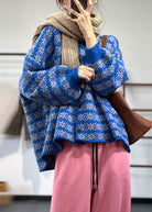 DIY Blue O-Neck Oversized Jacquard Lazy Knit Cardigans Winter
