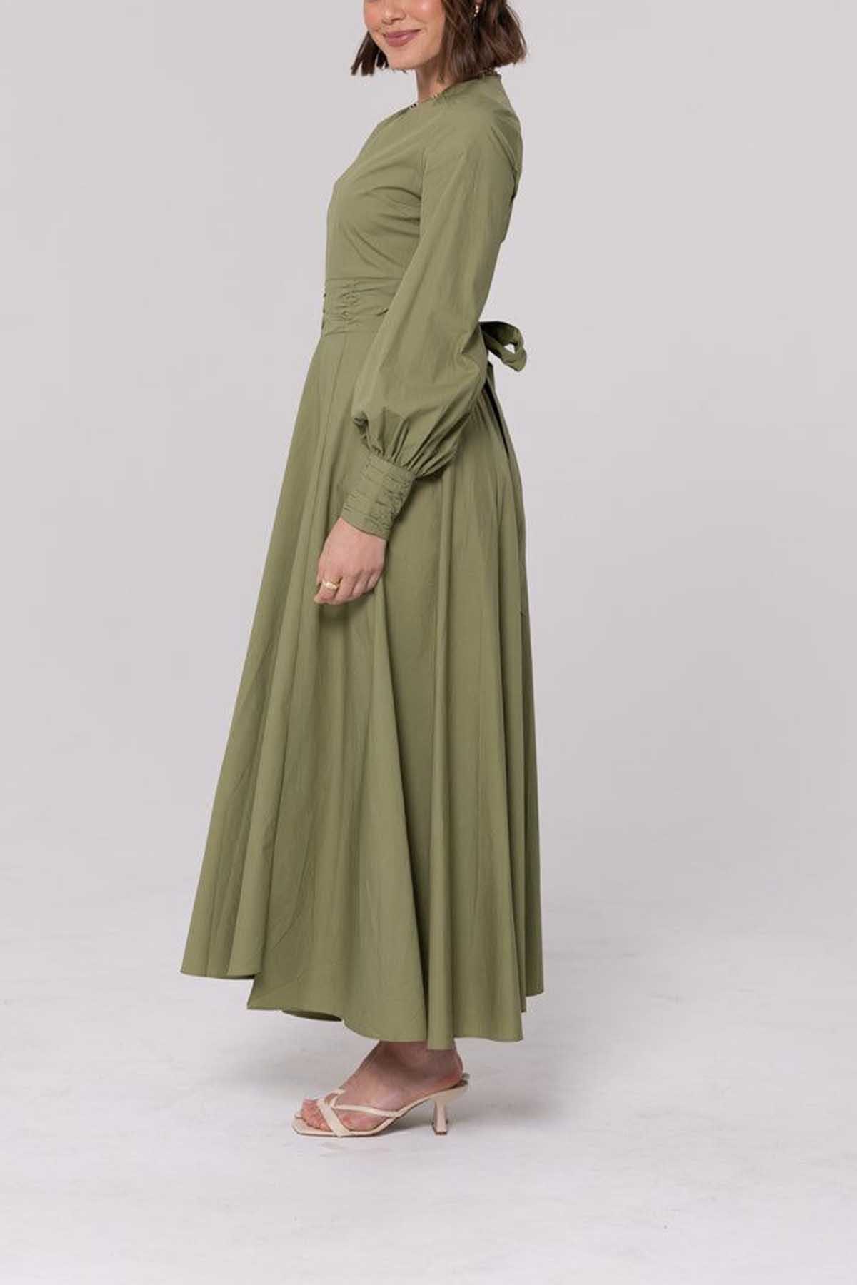 Luda captures a moment in time in a beautiful green poplin dress, featuring a fitted waistline and flowy bottom half. This is the perfect summer/spring dress which can be dressed up with strappy heels, or dressed down with your favourite sneakers or sandals.