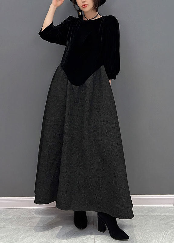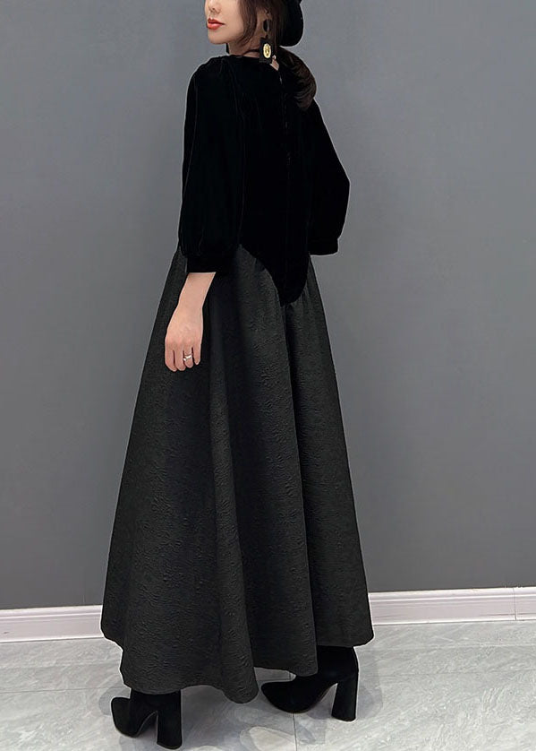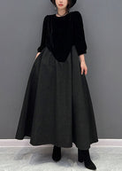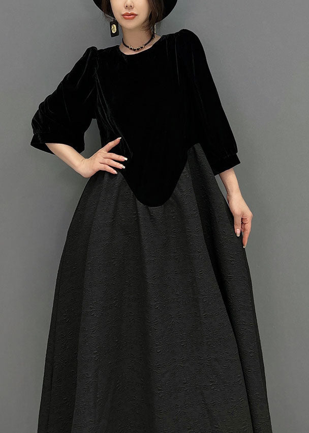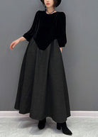 Fine Black O-Neck Asymmetrical Patchwork Silk Velour Dress Fall