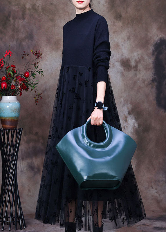 Fitted black O-Neck lace Patchwork Knit Vacation Dresses Spring