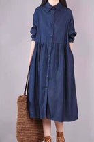 French Navy Peter Pan Collar Button Pockets Fall Long sleeve Denim Dress