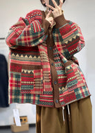 French Red V Neck Print Pockets Knit Loose Cardigan Winter