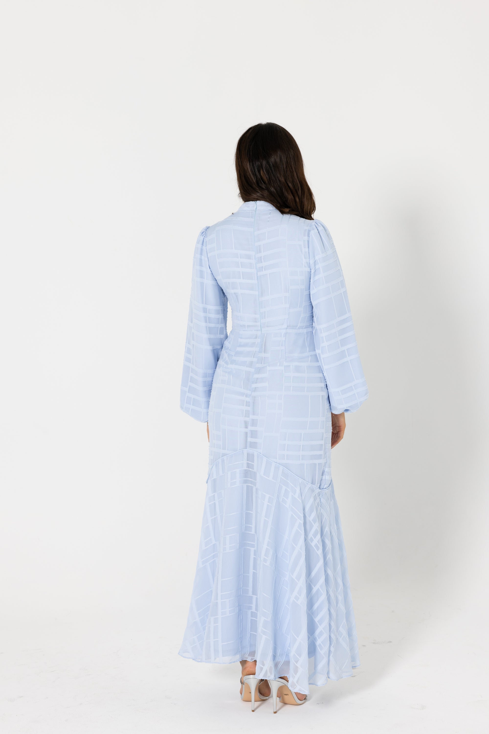 It’s all about the silhouette of this sculpted perfection of a dress. The Grace Blue Chiffon Maxi Dress is not short of intricate details. The luxe sheer textured fabric along with the flattering fit and flare silhouette gives this dress the ideal wow factor. This patterned blue dress is designed to transcend seasons and speak volumes on its own. Pair it with your favourite heels and you are ready to go! Can also be styled with our .