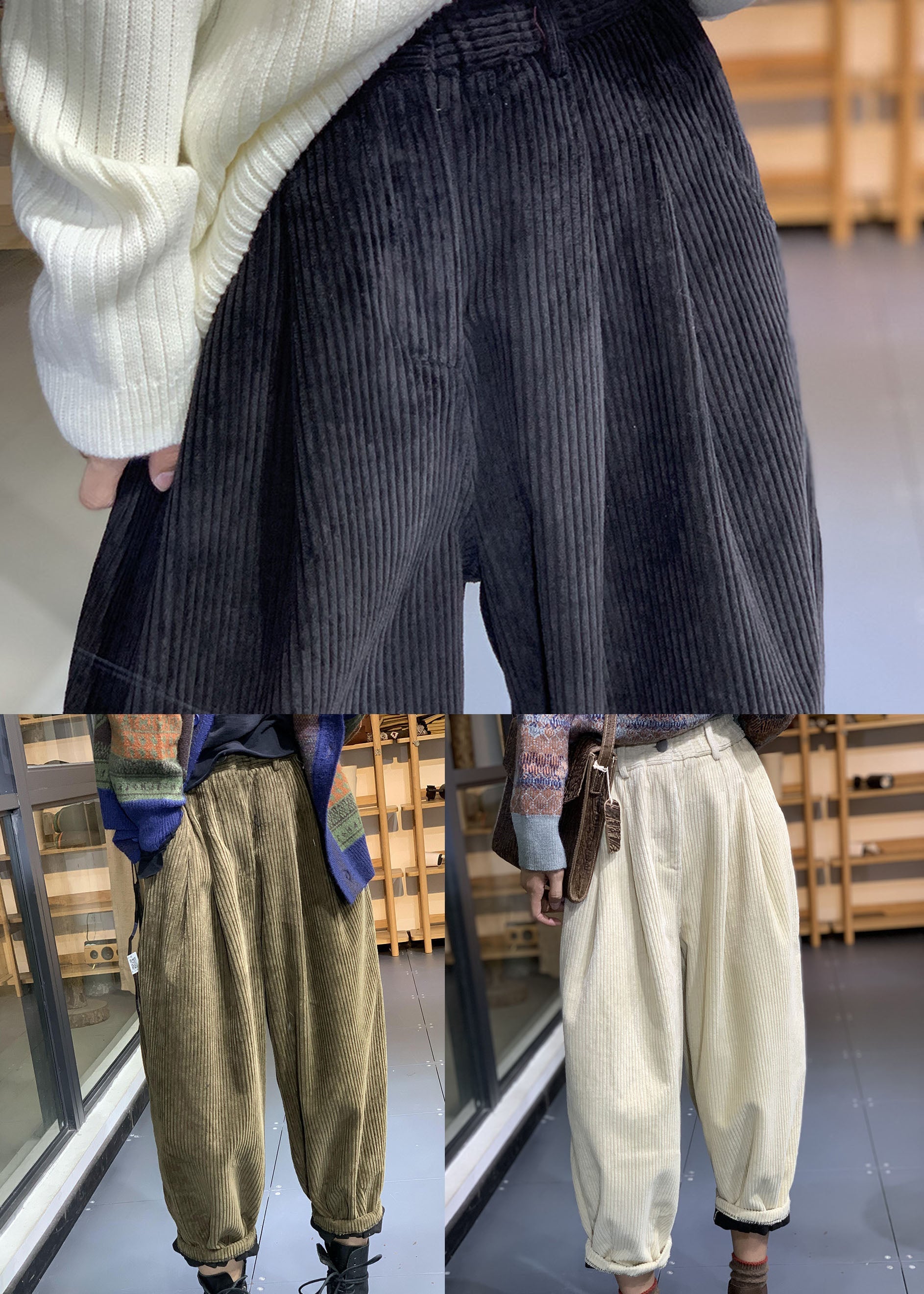 Italian Black Elastic Waist Pockets Warm Fleece Corduroy Pants Winter