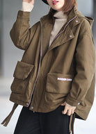 Khaki Hooded Zippered Winter Cotton Long sleeve Coat