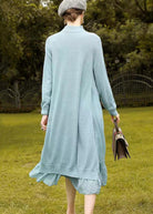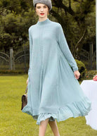 Light Blue Patchwork Woolen Dress Wrinkled Stand Collar Fall