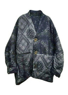 Loose Blue V Neck Print Button Cotton Filled Long Sleeve