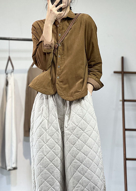 Stylish Coffee Peter Pan Collar Pockets Contton Filled Corduroy Coats Winter