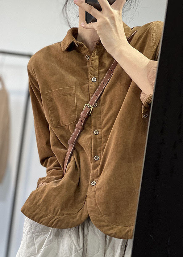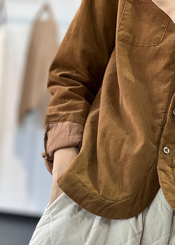 Stylish Chocolate Peter Pan Collar Pockets Contton Filled Corduroy Coats Winter