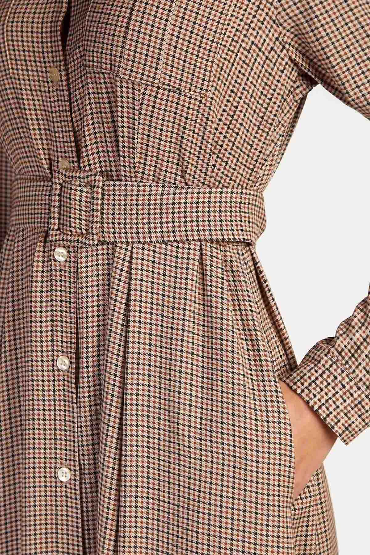 Our Utility Check Maxi has a micro houndstooth print in earthy browns and nude. Made from a soft viscose in medium weight fabric, the maxi showcases utility detailing with a feminine twist.